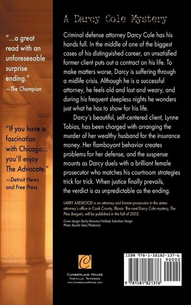 Criminal defense attorney Darcy Cole has his hands full. In the middle of one of the biggest cases of his distinguished career, an unsatisfied former client puts out a contract on his life. To make matters worse, Darcy is suffering through a midlife crisis. Although he is a successful attorney, he feels old and lost and weary, and during his frequent sleepless nights he wonders just what he has to show for his life. Darcy's beautiful, self-centered client, Lynne Tobias, has been charged with arranging the murder of her wealthy husband for the insurance money. Her flamboyant behavior creates problems for her defense, and the suspense mounts as Darcy duels with a brilliant female prosecutor who matches his courtroom strategies trick for trick. When justice finally prevails, the verdict is as unpredictable as the ending.