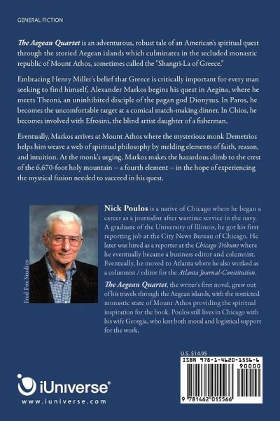 The Aegean Quartet is an adventurous, robust tale of an American's spiritual quest through the storied Aegean islands which culminates in the secluded monastic republic of Mount Athos, sometimes called the "Shangri-La of Greece." Embracing Henry Miller's belief that Greece is critically important for every man seeking to find himself, Alexander Markos begins his quest in Aegina, where he meets Theoni, an uninhibited disciple of the pagan god Dionysus. In Paros, he becomes the uncomfortable target at a comical match-making dinner. In Chios, he becomes involved with Efrosini, the blind artist daughter of a fisherman. Eventually, Markos arrives at Mount Athos where the mysterious monk Demetrios helps him weave a web of spiritual philosophy by melding elements of faith, reason, and intuition. At the monk's urging, Markos makes the hazardous climb to the crest of the 6,670-foot holy mountain -- a fourth element -- in the hope of experiencing the mystical fusion needed to succeed in his quest.