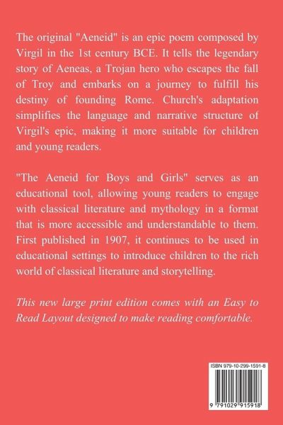 The original "Aeneid" is an epic poem composed by Virgil in the 1st century BCE. It tells the legendary story of Aeneas, a Trojan hero who escapes the fall of Troy and embarks on a journey to fulfill his destiny of founding Rome. Church's adaptation simplifies the language and narrative structure of Virgil's epic, making it more suitable for children and young readers. "The Aeneid for Boys and Girls" serves as an educational tool, allowing young readers to engage with classical literature and mythology in a format that is more accessible and understandable to them. First published in 1907, it continues to be used in educational settings to introduce children to the rich world of classical literature and storytelling. This new large print edition comes with an Easy to Read Layout designed to make reading comfortable.