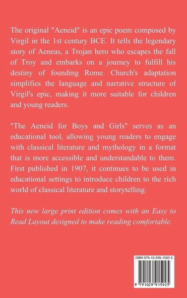 The original "Aeneid" is an epic poem composed by Virgil in the 1st century BCE. It tells the legendary story of Aeneas, a Trojan hero who escapes the fall of Troy and embarks on a journey to fulfill his destiny of founding Rome. Church's adaptation simplifies the language and narrative structure of Virgil's epic, making it more suitable for children and young readers. "The Aeneid for Boys and Girls" serves as an educational tool, allowing young readers to engage with classical literature and mythology in a format that is more accessible and understandable to them. First published in 1907, it continues to be used in educational settings to introduce children to the rich world of classical literature and storytelling. This new large print edition comes with an Easy to Read Layout designed to make reading comfortable.