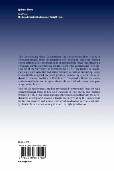 This outstanding thesis characterises the aerodynamic flow around a container freight train; investigating how changing container loading configurations affect the magnitude of aerodynamic forces measured on a container. 1/25th scale moving-model freight train experiments were carried out at the University of Birmingham's TRAIN rig facility to investigate slipstream velocities and static pressure, as well as measuring, using a specifically designed on-board pressure monitoring system, the aerodynamic loads on containers. Results were compared with full scale data and assessed in terms European standards for trackside worker and passenger safety limits.