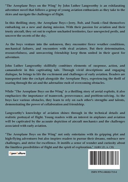 "The Aeroplane Boys on the Wing" by John Luther Langworthy is an exhilarating adventure novel that follows a group of young aviation enthusiasts as they take to the skies and navigate the challenges of flight. In this thrilling story, the Aeroplane Boys¿Jerry, Bob, and Frank¿find themselves embarking on a new and daring mission. With their passion for aviation and their trusty aircraft, they set out to explore uncharted territories, face unexpected perils, and uncover the secrets of the sky. As the boys venture into the unknown, they encounter fierce weather conditions, mechanical failures, and encounters with rival aviators. But their determination, resourcefulness, and unwavering friendship keep them united in their quest for adventure. John Luther Langworthy skillfully combines elements of suspense, action, and camaraderie in this captivating tale. Through vivid descriptions and engaging dialogue, he brings to life the excitement and challenges of early aviation. Readers are transported into the cockpit alongside the Aeroplane Boys, experiencing the thrill of soaring through the air and the adrenaline rush of overcoming obstacles. While "The Aeroplane Boys on the Wing" is a thrilling story of aerial exploits, it also emphasizes the importance of teamwork, perseverance, and problem-solving. As the boys face various obstacles, they learn to rely on each other's strengths and talents, demonstrating the power of collaboration and friendship. Langworthy's knowledge of aviation shines through in the technical details and realistic portrayal of flight. Young readers with an interest in airplanes and aviation will be captivated by the accurate depiction of aircraft mechanics and the challenges associated with early aviation. "The Aeroplane Boys on the Wing" not only entertains with its gripping plot and high-flying adventures but also inspires readers to pursue their dreams, embrace new challenges, and strive for excellence. It instills a sense of wonder and curiosity about the limitless possibilities of flight and the spirit of exploration."