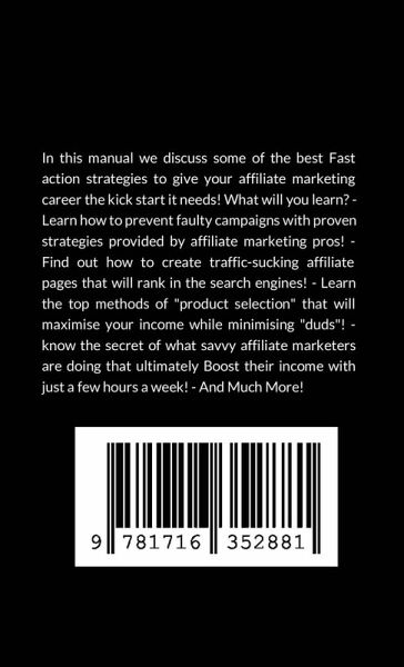 In this manual we discuss some of the best Fast action strategies to give your affiliate marketing career the kick start it needs! What will you learn? - Learn how to prevent faulty campaigns with proven strategies provided by affiliate marketing pros! - Find out how to create traffic-sucking affiliate pages that will rank in the search engines! - Learn the top methods of "product selection" that will maximise your income while minimising "duds"! - know the secret of what savvy affiliate marketers are doing that ultimately Boost their income with just a few hours a week! - And Much More!