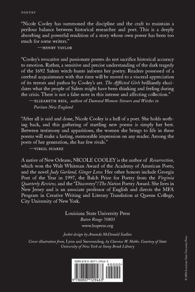 Twenty individuals were executed and more than 150 imprisoned. The historical body of evidence that remains from the Salem witch trials of 1692 touched the hands, mind, and imagination of poet Nicole Cooley, compelling her to seek entry to an inaccessible past of lies. The Afflicted Girls, so named after the young women who claimed to be victims of witch-craft, spans the centuries to give voice to those both audible and silent on history's pages - accusers and accused of several kinds: wife and husband, servant and master, congregant and minister, and, not least, bewitched and witch. Piercing, enchanting, Cooley's poems form a remarkable narrative, one that displays the enormous cultural power the Salem witch trials retain in twenty-first-century America.