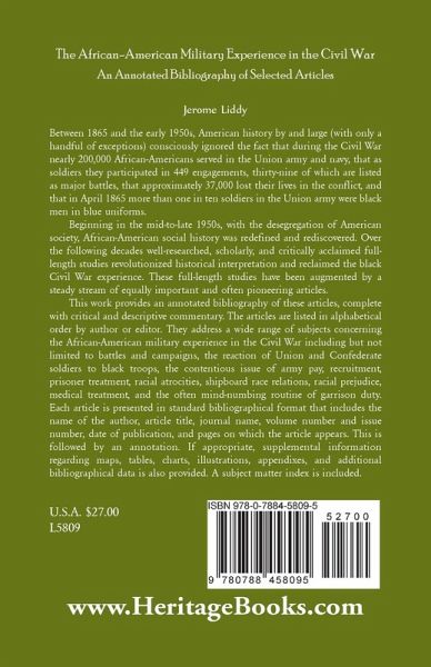 Between 1865 and the early 1950s, American history by and large (with only a handful of exceptions) consciously ignored the fact that during the Civil War nearly 200,000 African-Americans served in the Union army and navy, that as soldiers they participated in 449 engagements, thirty-nine of which are listed as major battles, that approximately 37,000 lost their lives in the conflict, and that in April 1865 more than one in ten soldiers in the Union army were black men in blue uniforms. Beginning in the mid-to-late 1950s, with the desegregation of American society, African-American social history was redefined and rediscovered. Over the following decades well-researched, scholarly, and critically acclaimed full-length studies revolutionized historical interpretation and reclaimed the black Civil War experience. These full-length studies have been augmented by a steady stream of equally important and often pioneering articles. This work provides an annotated bibliography of these articles, complete with critical and descriptive commentary. The articles are listed in alphabetical order by author or editor. They address a wide range of subjects concerning the African-American military experience in the Civil War including but not limited to battles and campaigns, the reaction of Union and Confederate soldiers to black troops, the contentious issue of army pay, recruitment, prisoner treatment, racial atrocities, shipboard race relations, racial prejudice, medical treatment, and the often mind-numbing routine of garrison duty. Each article is presented in standard bibliographical format that includes the name of the author, article title, journal name, volume number and issue number, date of publication, and pages on which the article appears. This is followed by an annotation. If appropriate, supplemental information regarding maps, tables, charts, illustrations, appendixes, and additional bibliographical data is also provided. A subject matter index is included.