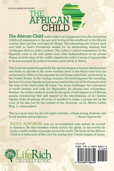 The African Child author tells it as it happened from the harrowing childhood experience to the ups and downs of his adulthood in the African capital cities and the rural typical village. The interesting mix of hard work and faith in God’s Providence makes for an exhilarating reading that challenges African policy makers. The author’s critical assessment of the Nigerian crisis in the mid sixties soon after Independence as he places blame on both sides of the conflict depicts the writer’s sense of impartiality to be encouraged by political leaders particularly in Africa. This book examines thoughtfully the various stages in human development and finds no excuse in the down trodden level of the black man from his native land in Africa to his imposed second home anywhere, particularly in the United States. In the closing chapters the book exposes the hardship, the loss of human dignity and personal exploitation of all black people from the days of the slave trade till today. The book challenges the conscience of world leaders and calls for Reparation for slavery and colonialism. Besides, the author seeks to inculcate the spirit of self respect in all African people maintaining that self respect is the smoothening oil for human dignity while chastising all races of mankind to judge a person not by the color of his skin but by the content of his character, as Dr. Martin Luther King. Jr. admonished. This is a must read for all civil rights activists, college young students and world leaders and politicians. —Asuzu Agwunobi