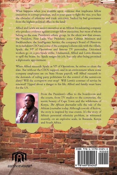 What happens when you stumble upon evidence that implicates fellow executives in corrupt practices, and in your quest to fight the vice, you face the obstacles of ethnicity and trade unionism, backed by bad governance from the highest political office in the land? Alfred and Lewis are senior executives at an African broadcasting company who produce evidence against corrupt fellow executives, but most of whom belong to the state President's ethnic group. In the silent war that ensues, the President, First Lady, Vice President, some Cabinet Ministers and Backbenchers, the Intelligence Service, the company's Board of Directors, its nonchalant CEO and some of the company's clients side with the villain, Spade, the VP of Operations and famous TV personality. Unionized workers go on a pro-Spade strike. Undaunted, Alfred and Lewis threaten to spill the beans. So, Spade resigns his job, but only after being promised a diplomatic appointment. When Alfred succeeds Spade as VP of Operations, he strives to clean the slate. But without the CEO's support, and in an environment where some company employees are on State House payroll, will Alfred succumb to the demands of ruling party politicians for the control of the newsroom diary? Will the corruption ever stop? Will Lewis's contract of service be renewed? Tipped about a danger to his life, Alfred and family must leave for the US. From the President's office to the boardroom and the courts, from TV studios to the cemeteries, the scenic beauty of Cape Town and the wilderness of Kenya, The African Journalist tells the tale of the African journalist today. Although a work of fiction, the story is inspired by true events. It's the story of Africa's perennial ethnicity problem, as witnessed recently, on an explosive scale, in Rwanda, Kenya and South Africa.