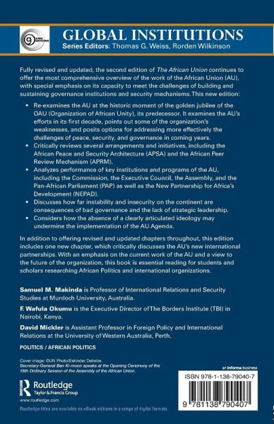 In addition to offering revised and updated chapters throughout, this edition includes one new chapter, which critically discusses the AU's new international partnerships. With an emphasis on the current work of the AU and a view to the future of the organization, this book is essential reading for students and scholars researching African Politics and international organizations.