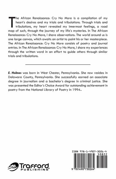 The African Renaissance: Cry No More is a compilation of my heart's desires and my trials and tribulations. Through trials and tribulations, my heart revealed my innermost feelings, a road map of such, through the journey of my life's mysteries. In The African Renaissance: Cry No More, I share observations. The world around us is one large canvas, which awaits an artist to paint his or her masterpiece. The African Renaissance: Cry No More consists of poetry and journal entries. In The African Renaissance: Cry No More, I share my experiences through the written word in an effort to guide others through similar trials and tribulations.