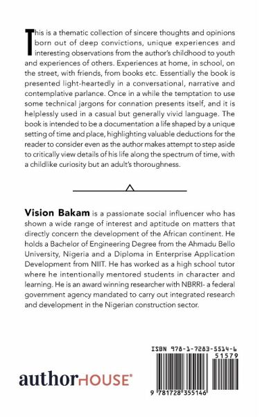 This is a thematic collection of sincere thoughts and opinions born out of deep convictions, unique experiences and interesting observations from the author's childhood to youth and experiences of others. Experiences at home, in school, on the street, with friends, from books etc. Essentially the book is presented light-heartedly in a conversational, narrative and contemplative parlance. Once in a while the temptation to use some technical jargons for connation presents itself, and it is helplessly used in a casual but generally vivid language. The book is intended to be a documentation a life shaped by a unique setting of time and place, highlighting valuable deductions for the reader to consider even as the author makes attempt to step aside to critically view details of his life along the spectrum of time, with a childlike curiosity but an adult's thoroughness.