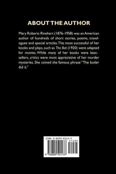 Mary Roberts Rinehart (1876-1958) was an American author of hundreds of short stories, poems, travelogues and special articles. Some of her very successful books and plays, such as "The Bat" (1920) were adapted for movies. While many of her books were best-sellers, critics were most appreciative of her murder mysteries. She also coined the famous phrase "The butler did it."