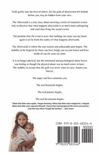 In this book, I write about the incredible journey my soul undertook to find the answers that were plaguing my every thought as a child, and later, overwhelmed me as an adult. I talk about my desperate search for answers during an anger phase that was untaught to me from the circumstances I reluctantly found myself in. My torment and agony as a child led me to question all that I thought I knew and believed to be true as I began to pay attention to 'the fight inside,' and ignore how people thought I should cope. It may be that they too, were asking these haunting questions. They too, might have been searching for a way out of an ambush. But, they never found it. I told her about the door handle that turned at night, and that no matter where I hid, be it under the bed, in the closet, or in my sisters' bedroom, he still found me. I told her that sometimes, he'd bring others with him and that it scared me. I told her not to cry because we were still okay, but that I worried about my Lily. I told her that I thought the monster was what was making her sick, and what had brought the seizures to her. I told her that Lisa was crying, but that she couldn't see her tears. They were bouncing around inside of her. I told her that we knew he was beating her, and we would hear her cry in the night. I asked her to stop him, we are afraid he might kill her. I told her about the firearm he kept hidden in his closet, and how often he brought it into my bedroom to remind me to keep our secret. I told her I had learned how to use it. I told her that the next time he drove us at full speed, aiming for a solid brick wall, that he might not want to stop and that we would ultimately hit the wall. I told her that I didn't want my sisters to die. I told her that when she left for the stores, to please let us go with her because when she left us behind, he did things to us. I told her that when she went to Church and left me at home to keep an eye on him, he did things. I told her that sometimes, I could feel my heart beating so loudly that I hoped she could hear. I told her that I wanted my father back, and that I wanted my sisters to live. I told her that I could remember the day it all began, and that it was the precise instant he left. I told her that most nights, it was pitch black around me and that my eyes often struggled to penetrate the darkness, no matter which way I would turn. As the boogeyman would come closer, it would be as a diffused glow ahead of me. I told her how heavily it weighed on my shoulders and how the darkness would brood and rotate around us all. Listening to the boogeyman's threats made me feel isolated and secluded, and scared me like I had never known fear before. I told her that as much as I wanted to run away from it all, I couldn't move. I was frozen. I couldn't fight. I was paralyzed. It was as though I was being slammed into invisible barriers all around me and that the piercing moaning of the boogeyman made it hard to breathe. I told her that hell was our home and that the devil was living amongst us. It was waging a battle against us, trapping us in fear and striking out at us with each ounce of aggression he could muster up. I told her of the lies he has convinced himself would turn into the truth, desperate to erase his brutality. I told her that I hated him and living one more moment with him would only guarantee more hatred, betrayal, hostility and pain. I told her that I knew she didn't know, and that I knew she didn't hear our screams. They were silent, bouncing around inside of us. I asked her to help us stop it, because I couldn't stand one more night in the darkness. I told her my sisters wouldn't survive. And then, I told her how truly sorry I was, and how I wished we could go back to before.