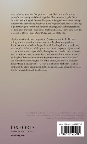 This commentary discusses Aeschylus' play Agamemnon (458 BC), which is one of the most popular of the surviving ancient Greek tragedies, and is the first to be published in English since 1958. It is designed particularly to help students who are tackling Aeschylus in the original Greek for the first time, and includes a reprint of D. L. Page's Oxford Classical Text of the play. The introduction defines the place of Agamemnon within the Oresteia trilogy as a whole, and the historical context in which the plays were produced. It discusses Aeschylus' handling of the traditional myth and the main ideas which underpin his overall design: such as the development of justice and the nature of human responsibility; and it emphasizes how the power of words, seen as ominous speech-acts which can determine future events, makes a central contribution to the play's dramatic momentum. Separate sections explore Aeschylus' use of theatrical resources, the role of the chorus, and the solo characters. Finally there is an analysis of Aeschylus' distinctive poetic style and use of imagery, and an outline of the transmission of the play from 458 BC to the first printed editions.