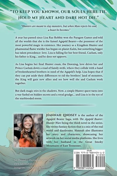 "To keep you known, our souls here tie. Hold my heart and dare not die." Hunters are meant to slay monsters, but when Man rejects his soul, a beast he becomes. A year has passed since Lisa Rae Robbie won the Paragon Games and told all the worlds that she is the famed Agapéd Bearer-the possessor of the most powerful magic in existence. Her journey as a Kingdom Hunter and phantasmal flame wielder has begun on planet Kalm, but something bigger has taken precedence: love. Lisa is falling for her best friend, Caelum, only his father is King... and he does not approve. As Lisa begins her final Hunter exam, the Dawning, love drives her and Prince Caelum down a road of family strife, where they collide with a band of brokenhearted brothers in need of the Agapéd's help. Lisa hopes that if they can put aside their differences to rid the brothers' land of monsters, the King will gain new allies and see how well she and Caelum work together. This edition of the book does not contain illustrations. Only the limited editions contain the author's colored illustrations. 2025 IngramSpark® Editorial Selection - Young Adult