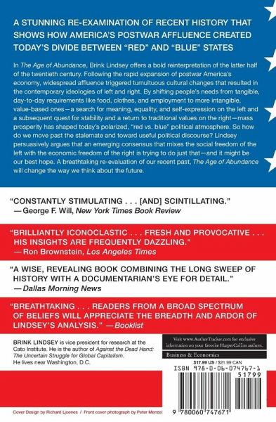 Until the 1950s, the struggle to feed, clothe, and employ the nation drove most of American political life. From slavery to the New Deal, political parties organized around economic interests and engaged in fervent debate over the best allocation of agonizingly scarce resources. But with the explosion of the nation's economy in the years after World War II, a new set of needs began to emerge--a search for meaning and self-expression on one side, and a quest for stability and a return to traditional values on the other. In The Age of Abundance, Brink Lindsey offers a bold reinterpretation of the latter half of the twentieth century. In this sweeping history of postwar America, the tumult of racial and gender politics, the rise of the counterculture, and the conservative revolution of the 1980s and 1990s are portrayed in an entirely new light. Readers will learn how and why the contemporary ideologies of left and right emerged in response to the novel challenges of mass prosperity. The political ideas that created the culture wars, however, have now grown obsolete. As the Washington Post aptly summarized Lindsey's take on the contradictions of American politics, "Republicans want to go home to the United States of the 1950s while Democrats want to work there." Struggling to replace today's stale conflicts is a new consensus that mixes the social freedom of the left with the economic freedom of the right into a potentially powerful ethos of libertarianism. The Age of Abundance reveals the secret formula of this remarkable alchemy. The book is a breathtaking reevaluation of our recent past--and will change the way we think about the future.