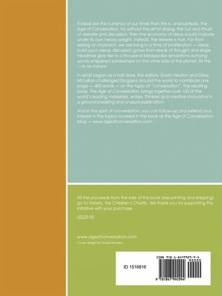 Softcover Edition. If ideas are the currency of our times then this is, undoubtedly, the Age of Conversation, for without the art of dialog, the cut and thrust of debate and discussion, then the economy of ideas would implode under its own heavy weight. Instead, the reverse is true. Far from seeing an implosion, we are living in a time of proliferation - ideas build upon ideas, discussion grows from seeds of thought and single headlines give rise to a thousand medusa-like simulations echoing words whispered somewhere on the other side of the planet. All this - in an instant. In what began as a half dare, the editors, Gavin Heaton and Drew McLellan challenged bloggers around the world to contribute one page - 400 words - on the topic of "conversation". The resulting book, The Age of Conversation, brings together over 100 of the world's leading marketers, writers, thinkers and creative innovators in a ground-breaking and unusual publication.