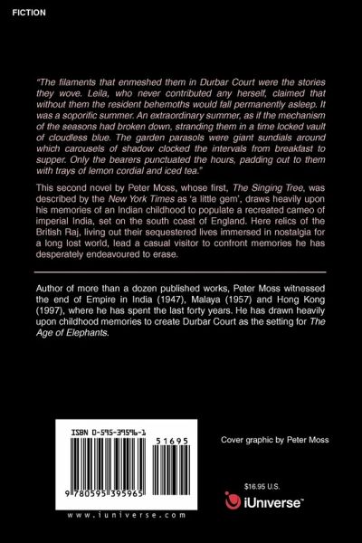 ¿The filaments that enmeshed them in Durbar Court were the stories they wove. Leila, who never contributed any herself, claimed that without them the resident behemoths would fall permanently asleep. It was a soporific summer. An extraordinary summer, as if the mechanism of the seasons had broken down, stranding them in a time locked vault of cloudless blue. The garden parasols were giant sundials around which carousels of shadow clocked the intervals from breakfast to supper. Only the bearers punctuated the hours, padding out to them with trays of lemon cordial and iced tea.¿ This second novel by Peter Moss, whose first, The Singing Tree, was described by the New York Times as `a little gem¿, draws heavily upon his memories of an Indian childhood to populate a recreated cameo of imperial India, set on the south coast of England. Here relics of the British Raj, living out their sequestered lives immersed in nostalgia for a long lost world, lead a casual visitor to confront memories he has desperately endeavoured to erase. A graceful, elaborate¿tale of innocents yearning for home. Moss has been a firsthand witness to the fading glory of the British diaspora in exotic locales like India, Hong Kong and the Philippines. Here, he draws heavily on a childhood spent in India to recreate the experiences of expatriates repatriated against their will, caught between a glorious spiritual home and the draw of Queen and country. Moss fosters a charming colonial memory that will speak clearly to anyone who's been away from home a long time. A romanticized, tragic remembrance of well-loved experiences. -Kirkus Discoveries