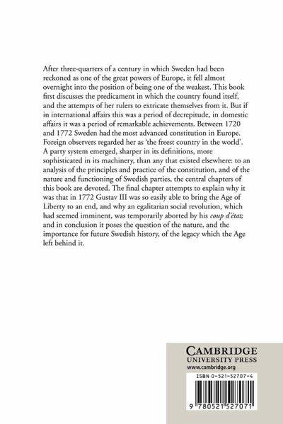 After three-quarters of a century in which Sweden had been reckoned as one of the great powers of Europe, it fell almost overnight into the position of being one of the weakest. But if in international affairs this was a period of decrepitude, in domestic affairs it was a period of remarkable achievements. Between 1720 and 1772 Sweden had the most advanced constitution in Europe. Foreign observers regarded her as 'the freest country in the world'. To an analysis of the principles and practice of the constitution, and of the nature and functioning of Swedish parties, the central chapters of this book are devoted. The final chapter attempts to explain why it was that in 1772 Gustav III was so easily able to bring the Age of Liberty to an end, and why an egalitarian social revolution, which had seemed imminent, was temporarily aborted by his coup d'état.