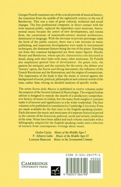 Giorgio Pestelli examines one of the crucial periods of musical history, the transition from the middle of the eighteenth century to the era of Beethoven. This was a time of great cultural, technical and social changes. The free professional composer, in direct contact with the wide musical public, replaced the dependent court musician. Instrumental music became the centre of new developments, and sonata form, the cornerstone of nineteenth-century musical architecture, dominated its language. With the decrease in private patronage came the birth of the public concert; there was a vast increase in music publishing, and important developments were made in instrumental techniques, the dominant feature being the rise of the piano. Standing out from this common background are three major figures: Haydn, Mozart and Beethoven, whose specific characteristics are discussed in detail, along with their links with many other musicians. Dr Pestelli also emphasizes general lines of development: the galant style, the passion for antiquity and the curiosity for the exotic, the debate over 'literary' opera, the Sturm and Drang movement, the influence of the French Revolution and the Restoration, and the origins of romanticism. The importance of the book is that the music is viewed against the background of social, political, philosophical and cultural trends of the time, rather than relying on detailed analyses of specific works. The series Storia della Musica is published in twelve volumes under the auspices of the Societa Italiana di Musicologia. The original Italian edition is designed to remedy the dearth of a satisfactory comprehensive history of music in Italian, but the many fresh insights itcontains make it of interest and significance to a far wider readership. The four volumes to be published in translation by Cambridge University Press are made available for the first time to the English-speaking student. Each discusses the music and musicians of a separa