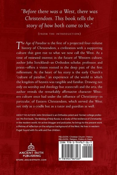 "Before there was a West, there was Christendom. This book tells the story of how both came to be." (from the Introduction) The Age of Paradise is the first of a projected four-volume history of Christendom, a civilization with a supporting culture that gave rise to what we now call the West. At a time of renewed interest in the future of Western culture, author John Strickland-an Orthodox scholar, professor, and priest-offers a vision rooted in the deep past of the first millennium. At the heart of his story is the early Church's "culture of paradise," an experience of the world in which the kingdom of heaven was tangible and familiar. Drawing not only on worship and theology but statecraft and the arts, the author reveals the remarkably affirmative character Western culture once had under the influence of Christianity-in particular, of Eastern Christendom, which served the West not only as a cradle but as a tutor and guardian as well.