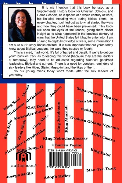 It is my intention that this book be used as a Supplemental History Book for Christian Schools, and Home Schools, as it speaks of a whole century of wars, but it's also including wars during biblical times. In every chapter, I pointed out as to what started the wars and how they could have been prevented. This book will open the eyes of the reader, giving them closer insight as to what happened in the previous century of wars that the United States felt it had to enter into. I am sharing In-depth knowledge of wars, some information I am sure our History Books omitted. It is also important that our youth today know about Biblical Leaders, the wars they caused or fought. This is a mad, mad world. It's full of hatred and deceit. If we're to get our youth back on track as to leading this world (because they are the leaders of tomorrow), they need to be educated regarding historical good/bad leadership, Biblical and current. There is a need for constant reminders of sick leaders like Hitler, Stalin, Mussolini, and the likes of them. So our young minds today won't model after the sick leaders of yesterday.