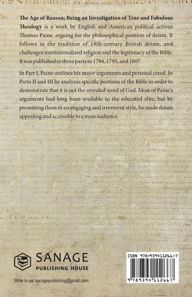 The Age of Reason; Being an Investigation of True and Fabulous Theology is a work by English and American political activist Thomas Paine, arguing for the philosophical position of deism. It follows in the tradition of 18th-century British deism, and challenges institutionalized religion and the legitimacy of the Bible. It was published in three parts in 1794, 1795, and 1807. In Part I, Paine outlines his major arguments and personal creed. In Parts II and III he analyzes specific portions of the Bible in order to demonstrate that it is not the revealed word of God. Most of Paine's arguments had long been available to the educated elite, but by presenting them in an engaging and irreverent style, he made deism appealing and accessible to a mass audience.
