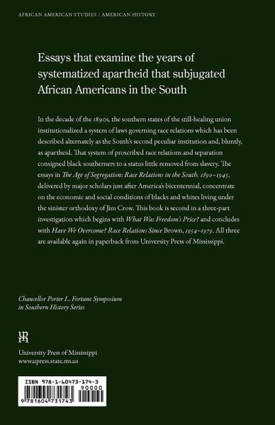 The Age of Segregation: Race Relations in the South, 1890-1945 Edited by Robert Haws Essays by Derrick Bell, Mary Frances Berry, Dan Carter, Al-Tony Gilmore, Robert Higgs, and George Tindall In the decade of the 1890s, the southern states of the still-healing union institutionalized a system of laws governing race relations which has been described alternately as the South's second peculiar institution and, bluntly, as apartheid. That system of proscribed race relations and separation consigned black southerners to a status little removed from slavery. The essays in The Age of Segregation: Race Relations in the South, 1890-1945, delivered by major scholars just after America's bicentennial, concentrate on the economic and social conditions of blacks and whites living under the sinister orthodoxy of Jim Crow. This book is second in a three-part investigation which begins with What Was Freedom's Price? and concludes with Have We Overcome? Race Relations since Brown, 1954-1979. All three are available again in paperback from University Press of Mississippi. Robert Haws is Chair of the Department of Public Policy Leadership at the University of Mississippi.