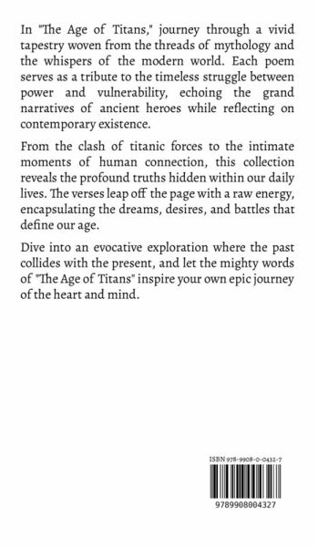 In "The Age of Titans," journey through a vivid tapestry woven from the threads of mythology and the whispers of the modern world. Each poem serves as a tribute to the timeless struggle between power and vulnerability, echoing the grand narratives of ancient heroes while reflecting on contemporary existence. From the clash of titanic forces to the intimate moments of human connection, this collection reveals the profound truths hidden within our daily lives. The verses leap off the page with a raw energy, encapsulating the dreams, desires, and battles that define our age. Dive into an evocative exploration where the past collides with the present, and let the mighty words of "The Age of Titans" inspire your own epic journey of the heart and mind.