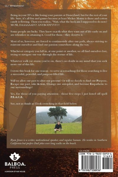 Being in your 20s is like losing your parents at Disneyland, but for the rest of your life. Sure, its all fun and games because at least Mickey Mouse is there and cotton candy is flowing. Then you realize, Wait, what the heck am I supposed to do now? MOM, DAAAAAAD!?! ANYBODYYYY!?! Some people are lucky. They know exactly what they want out of life early on and are relentless in attaining it. Good for them they deserve it. Most of us, however, are forced to continuously alter our path, always striving to reinvent ourselves and find our passion somewhere along the way. Whichever category you fall in, at one point or another, we all find ourselves lost, trying to navigate our way through the storms of life. Whatever walk (or storm) youre on, theres no doubt in my mind that you seek more out of this life. I wrote this book for one reason - to serve as a roadmap for those searching to live a successful, peaceful, and purpose-filled life. Will we allow our past to alter our present? Or will we decide to find our Purpose, Escape our past, take Action, Change our autopilot, and become Empathetic to our surroundings? Yes, for those of you paying attention - those five steps I just listed off spell P.E.A.C.E. See, not as dumb as I look crouching in that field below.
