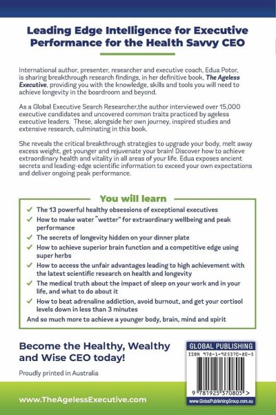 Leading edge intelligence for executive performance for the health-savvy CEO. International author, presenter, researcher and executive coach, Edua Potor, is sharing breakthrough research findings in her definitive book The Ageless Executive, providing you with the knowledge, skills and tools you will need to achieve longevity in the boardroom and beyond. As a global executive search researcher, the author interviewed over 15,000 executive candidates and uncovered common traits practiced by ageless executive leaders. These, alongside her own journey, inspired studies and extensive research, culminating in this book. She reveals the critical breakthrough strategies to upgrade your body, melt away excess weight, get younger and rejuvenate your brain! Discover how to achieve extraordinary health and vitality in all areas of your life. Edua exposes ancient secrets and leading-edge scientific information to exceed your own expectations and deliver ongoing peak performance. You will learn:The 13 powerful healthy obsessions of exceptional executives How to make water "wetter" for extraordinary wellbeing and peak performance The secrets of longevity hidden on your dinner plate How to achieve superior brain functioning and a competitive edge using super herbs How to access the unfair advantages leading to high achievement with the latest scientific research on health and longevity The medical truth about the impact of sleep on your work and in your life, and what to do about it How to beat adrenaline addiction, avoid burnout, and get your cortisol levels down in less than 3 minutes And so much more to achieve a younger body, brain, mind and spirit. Become the healthy, wealthy and wise CEO today!
