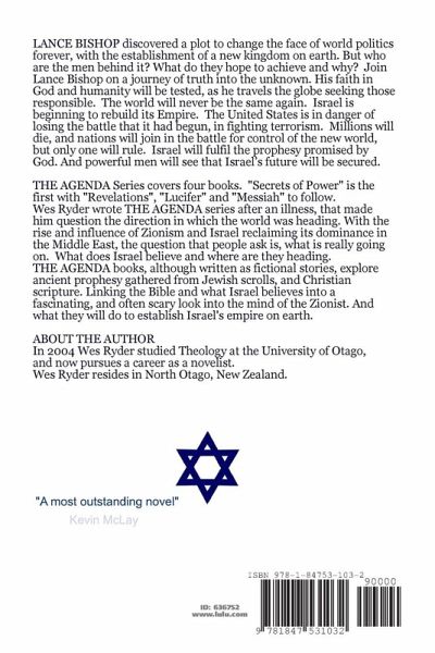 The first of four novels "Secrets of Power" "Revelations" "Lucifer" and "Messiah", reveal the men behind the largest terror attack the world will ever witness. Hidden deep within the Zionist Council are a group of manipulators, who shape the world on a daily bases. They have their own agenda which will begin to unfold. The first in The Agenda books Secrets of Power begins in the dark heart of Dunedin New Zealand, and races around the globe through Asia and Europe on a breathtaking journey that will challenge your reality. Ancient mysteries are re-examined, and secrets will be revealed in a tight plot. That gives the intelligent reader a chance to draw on their own conclusions, about Israel's destiny and the Zionist Agenda. Based on Christian, Islamic and Jewish prophesy, on the coming of the Messiah, and the rebuilding of the Israeli empire, with the establishment of a united Europe as a new world order. Although written as fiction, THE AGENDA books have a message of their own.