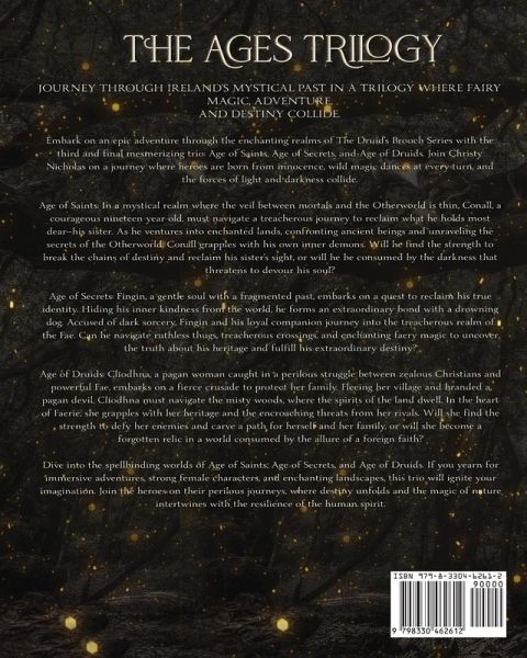 Journey through Ireland's mystical past in a trilogy where fairy magic, adventure, and destiny collide. Embark on an epic adventure through the enchanting realms of The Druid's Brooch Series with the third and final mesmerizing trio: Age of Saints, Age of Secrets, and Age of Druids. Join Christy Nicholas on a journey where wild magic dances at every turn and the forces of light and darkness collide. Age of Saints: In a mystical realm where the veil between mortals and the Otherworld is thin, Conall, a courageous nineteen-year-old, must navigate a treacherous journey to reclaim what he holds most dear-his sister. As he ventures into enchanted lands, confronting ancient beings and unraveling the secrets of the Otherworld, Conall grapples with his own inner demons. Will he find the strength to break the chains of destiny and reclaim his sister's sight, or will he be consumed by the darkness that threatens to devour his soul? Age of Secrets: Fingin, a gentle soul with a fragmented past, embarks on a quest to reclaim his true identity. Hiding his inner kindness from the world, he forms an extraordinary bond with a drowning dog. Accused of dark sorcery, Fingin and his loyal companion journey into the treacherous realm of the Fae. Can he navigate ruthless thugs, treacherous crossings, and enchanting faery magic to uncover the truth about his heritage and fulfill his extraordinary destiny? Age of Druids: Clíodhna, a pagan woman caught in a perilous struggle between zealous Christians and powerful Fae, embarks on a fierce crusade to protect her family. Fleeing her village and branded a pagan devil, Clíodhna must navigate the misty woods, where the spirits of the land dwell. In the heart of Faerie, she grapples with her heritage and the encroaching threats from her rivals. Will she find the strength to defy her enemies and carve a path for herself and her family, or will she become a forgotten relic in a world consumed by the allure of a foreign faith? Dive into the spellbinding worlds of Age of Saints, Age of Secrets, and Age of Druids. If you yearn for immersive adventures, strong female characters, and enchanting landscapes, this trio will ignite your imagination. Join the heroes on their perilous journeys, where destiny unfolds and the magic of nature intertwines with the resilience of the human spirit. Start reading The Ages Trilogy trio today and let the wonder of these extraordinary tales captivate your soul. Each book in The Druid's Brooch Series can be read in any order as a standalone historical fantasy, allowing you to embark on any mesmerizing journey that calls to your soul.
