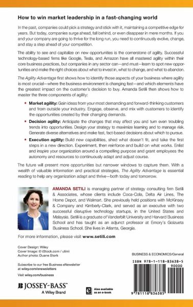 How to win market leadership in a fast-changing world In the past, companies could pick a strategy and stick with it, maintaining a competitive edge for years. But today, companies surge ahead, fall behind, or even disappear in mere months. If you and your company are going to thrive for the long run, you need to continuously evolve, change, and stay a step ahead of your competition. The ability to see and capitalize on new opportunities is the cornerstone of agility. Successful technology-based firms like Google, Tesla, and Amazon have all mastered agility within their core business practices, but companies in any sector can--and must--learn to spot new opportunities and make the right choices about what to invest in, what to change, and what to abandon. The Agility Advantage first shows how to identify those aspects of your business where agility is most crucial--where the business environment is changing fast--and which elements have the greatest impact on the customer's decision to buy. Amanda Setili then shows how to master the three components of agility: * Market agility: Gain ideas from your most demanding and forward-thinking customers and from outside your industry. Engage, observe, and mix with customers to identify the opportunities created by their changing demands. * Decision agility: Anticipate the changes that may affect you and turn even troubling trends into opportunities. Design your strategy to maximize learning and to manage risk. Generate diverse alternatives and make fast, fact-based decisions about which to pursue. * Execution agility: Build new capabilities, shed what doesn't fit, and take the first steps in a new direction. Experiment, then reinforce and build on what works. Enlist and inspire your organization around a compelling purpose and grant employees the autonomy and resources to continuously adapt and adjust course. The future will present more opportunities but narrower windows to capture them. With a wealth of valuable information and practical strategies, The Agility Advantage is essential reading to help any organization adapt and thrive--both today and tomorrow.