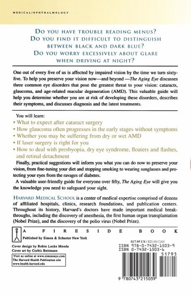 DO YOU HAVE TROUBLE READING MENUS? DO YOU FIND IT DIFFICULT TO DISTINGUISH BETWEEN BLACK AND DARK BLUE? DO YOU WORRY EXCESSIVELY ABOUT GLARE WHEN DRIVING AT NIGHT? One out of every five of us is affected by impaired vision by the time we turn sixty-five. To help you preserve your vision now -- and beyond -- The Aging Eye discusses three common eye disorders that pose the greatest threat to your vision: cataracts, glaucoma, and age-related macular degeneration (AMD). This valuable guide will help you determine whether you are at risk of developing these disorders, describes their symptoms, and discusses diagnosis and the latest treatments. You will learn: * What to expect after cataract surgery * How glaucoma often progresses in the early stages without symptoms * Whether you may be suffering from dry or wet AMD * If laser surgery is right for you * How to deal with presbyopia, dry eye syndrome, floaters and flashes, and retinal detachment Finally, practical suggestions will inform you what you can do now to preserve your vision, from fine-tuning your diet and stopping smoking to wearing sunglasses and protecting your eyes from the ravages of diabetes. A valuable user-friendly guide for everyone over fifty, The Aging Eye will give you the knowledge you need to safeguard your sight.