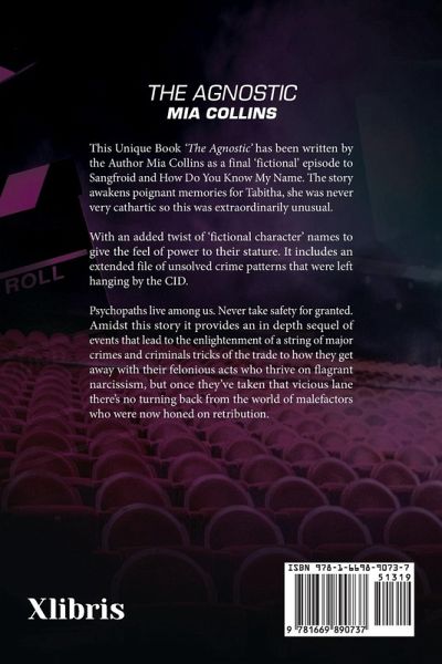 This Unique Book 'The Agnostic' has been written by the Author Mia Collins as a final 'fictional' episode to Sangfroid and How Do You Know My Name. The story awakens poignant memories for Tabitha, she was never very cathartic so this was extraordinarily unusual. With an added twist of 'fictional character' names to give the feel of power to their stature. It includes an extended file of unsolved crime patterns that were left hanging by the CID. Psychopaths live among us. Never take safety for granted. Amidst this story it provides an in depth sequel of events that lead to the enlightenment of a string of major crimes and criminals tricks of the trade to how they get away with their felonious acts who thrive on flagrant narcissism, but once they've taken that vicious lane there's no turning back from the world of malefactors who were now honed on retribution.
