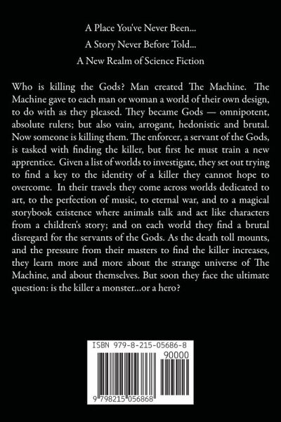 A Place You've Never Been... A Story Never Before Told... A New Realm of Science Fiction Who is killing the Gods? Man created The Machine. The Machine gave to each man or woman a world of their own design, to do with as they pleased. They became Gods - omnipotent, absolute rulers; but also vain, arrogant, hedonistic and brutal. Now someone is killing them. The enforcer, a servant of the Gods, is tasked with finding the killer, but first he must train a new apprentice. Given a list of worlds to investigate, they set out trying to find a key to the identity of a killer they cannot hope to overcome. In their travels they come across worlds dedicated to art, to the perfection of music, to eternal war, and to a magical storybook existence where animals talk and act like characters from a children's story; and on each world they find a brutal disregard for the servants of the Gods. As the death toll mounts, and the pressure from their masters to find the killer increases, they learn more and more about the strange universe of The Machine, and about themselves. But soon they face the ultimate question: is the killer a monster…or a hero?