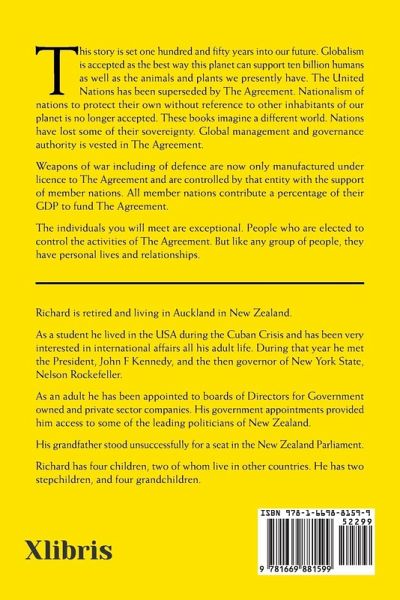 This story is set one hundred and fifty years into our future. Globalism is accepted as the best way this planet can support ten billion humans as well as the animals and plants we presently have. The United Nations has been superseded by The Agreement. Nationalism of nations to protect their own without reference to other inhabitants of our planet is no longer accepted. These books imagine a different world. Nations have lost some of their sovereignty. Global management and governance authority is vested in The Agreement. Weapons of war including of defence are now only manufactured under licence to The Agreement and are controlled by that entity with the support of member nations. All member nations contribute a percentage of their GDP to fund The Agreement. The individuals you will meet are exceptional. People who are elected to control the activities of The Agreement. But like any group of people, they have personal lives and relationships.