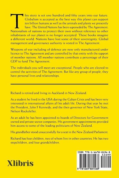 This story is set one hundred and fifty years into our future. Globalism is accepted as the best way this planet can support ten billion humans as well as the animals and plants we presently have. The United Nations has been superseded by The Agreement. Nationalism of nations to protect their own without reference to other inhabitants of our planet is no longer accepted. These books imagine a different world. Nations have lost some of their sovereignty. Global management and governance authority is vested in The Agreement. Weapons of war including of defence are now only manufactured under licence to The Agreement and are controlled by that entity with the support of member nations. All member nations contribute a percentage of their GDP to fund The Agreement. The individuals you will meet are exceptional. People who are elected to control the activities of The Agreement. But like any group of people, they have personal lives and relationships.