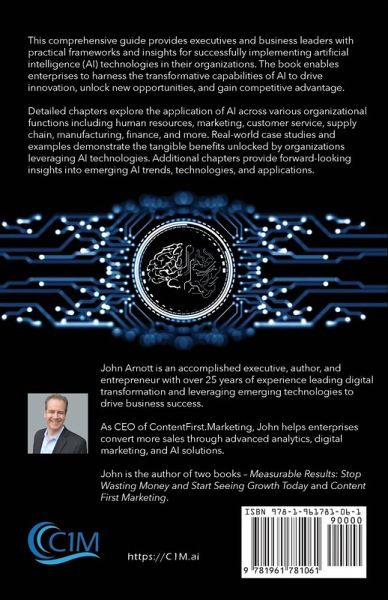 This comprehensive guide provides executives and business leaders practical frameworks and insights for successfully implementing artificial intelligence (AI) technologies in their organizations. The book enables enterprises to harness the transformative capabilities of AI to drive innovation, unlock new opportunities, and gain competitive advantage. The author draws from years of research and real-world experience to outline a strategic approach for enterprise AI adoption. The book covers critical topics such as clearly defining business objectives, assessing organizational readiness, developing robust data strategies, implementing ethical and responsible AI, changing management considerations, and continuously optimizing AI solutions. Detailed chapters explore the application of AI across various organizational functions, including human resources, marketing, customer service, supply chain, manufacturing, finance, and more. Real-world case studies and examples demonstrate the tangible benefits unlocked by organizations leveraging AI technologies. Additional chapters provide forward-looking insights into emerging AI trends, technologies, and applications. Written clearly and accessibly, this book serves as an indispensable guide for business leaders, executives, managers, and practitioners looking to leverage AI to transform their organizations. It provides the strategic clarity required to navigate the complexities of enterprise-scale AI implementation, unlock new sources of innovation and efficiency, and position organizations for resounding success in the age of artificial intelligence.