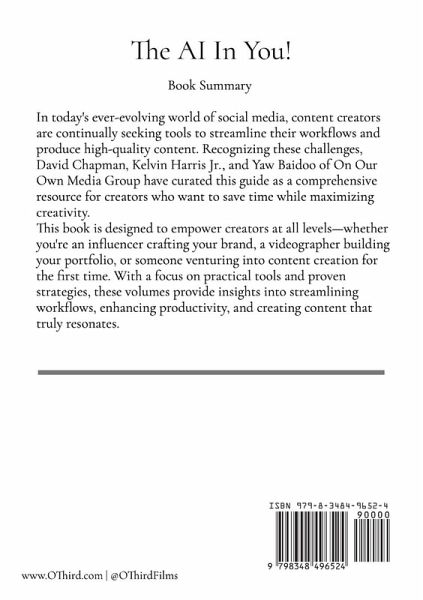 In today's ever-evolving world of social media, content creators are continually seeking tools to streamline their workflows and produce high-quality content. Recognizing these challenges, David Chapman, Kelvin Harris Jr., and Yaw Baidoo of On Our Own Media Group have curated this guide as a comprehensive resource for creators who want to save time while maximizing creativity.This book is designed to empower creators at all levels-whether you're an influencer crafting your brand, a videographer building your portfolio, or someone venturing into content creation for the first time. With a focus on practical tools and proven strategies, these volumes provide insights into streamlining workflows, enhancing productivity, and creating content that truly resonates.
