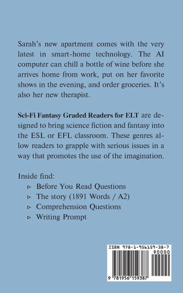 Sarah's new apartment comes with the very latest in smart-home technology. The AI computer can chill a bottle of wine before she arrives home from work, put on her favorite shows in the evening, and order groceries. It's also her new therapist. Sci-Fi Fantasy Graded Readers for ELT are designed to bring science fiction and fantasy into the ESL or EFL classroom. These genres allow readers to grapple with serious issues in a way that promotes the use of the imagination. Inside find: Before You Read Questions The story (1891 Words / A2) Comprehension Questions Writing Prompt