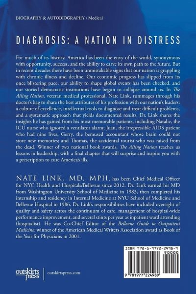 A NATION IN DISTRESS America has enjoyed an enviable life. Yet, in recent years, there have been unmistakable signs of chronic illness. Our economic progress has fallen off its once-blistering pace, our ability to shape world events has been checked, and our vaunted democratic institutions have begun to collapse around us. America is ailing. Now, here we are, nearly forty years into a chronic illness that has resisted our best efforts at diagnosis. Is this the cancer of our advancing age? The long, slow, terminal decline that will defy the best approaches of modern Medicine? Our fitful end? Not necessarily. In the past four decades, American hospitals have garnered principles of safety from the aviation industry, gathered tips about quality from automobile manufacturers, and gleaned insights into customer service from the hotel trade. These interstellar innovations launched American healthcare into a continuously self-improving model of advancing performance. As such, the world of Medicine has valuable assets to offer the political multiverse: A culture of excellence. Intellectual tools to diagnose and treat difficult problems. A systematic approach that guides almost everything we say and do, yet is seldom employed in the chambers of government. And now it is time to pay it forward. In this collection of riveting stories from patient narratives and leadership challenges - from heartbreaking tales of AIDS, to a harrowing evacuation during Superstorm Sandy, to the exhilarating conquest of Ebola - Dr. Nate Link translates a lifetime of experience into useful lessons for our nation’s leaders. To review these examples, he takes us to the bedside of his most memorable cases. We will learn from Natalie, the well-meaning ICU nurse who ignored the ventilator alarm, Juan, the irrepressible AIDS patient who had nine lives, Gerry, the bemused accountant whose brain could not store new memories, and Thomas, the accidental tourist who was raised from the dead. Two dozen other notable patients will teach us additional lessons in leadership. In the final chapter, our lessons will jointly lead us to a most unexpected conclusion and a prescription for the cure of our nation’s mysterious malady. Dr. Link is the Chief Medical Officer of Bellevue, America’s oldest public hospital, and has practiced there since arriving as a lowly intern at the onset of the AIDS epidemic. He earned his MD from Washington University School of Medicine in 1983, then completed his internship and residency in Internal Medicine at NYU School of Medicine and Bellevue Hospital in 1986. Dr. Link was Co-Chief Editor of the "Bellevue Guide to Outpatient Medicine," winner of the American Medical Writers Association award as Book of the Year for Physicians in 2001.