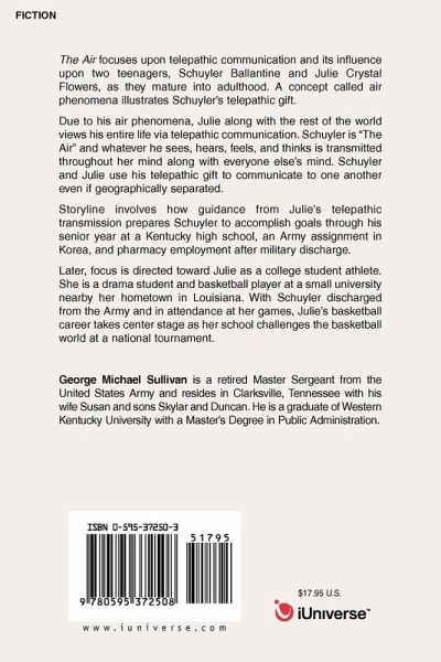 The Air focuses upon telepathic communication and its influence upon two teenagers, Schuyler Ballantine and Julie Crystal Flowers, as they mature into adulthood. A concept called air phenomena illustrates Schuyler's telepathic gift. Due to his air phenomena, Julie along with the rest of the world views his entire life via telepathic communication. Schuyler is 'The Air" and whatever he sees, hears, feels, and thinks is transmitted throughout her mind along with everyone else's mind. Schuyler and Julie use his telepathic gift to communicate to one another even if geographically separated. Storyline involves how guidance from Julie's telepathic transmission prepares Schuyler to accomplish goals through his senior year at a Kentucky high school, an Army assignment in Korea, and pharmacy employment after military discharge. Later, focus is directed toward Julie as a college student athlete. She is a drama student and basketball player at a small university nearby her hometown in Louisiana. With Schuyler discharged from the Army and in attendance at her games, Julie's basketball career takes center stage as her school challenges the basketball world at a national tournament.