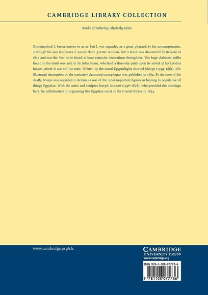Oimenepthah I, better known to us as Seti I, was regarded as a great pharaoh by his contemporaries, although his son Ramesses II would claim greater renown. Seti's tomb was discovered by Belzoni in 1817 and was the first to be found to have extensive decorations throughout. The huge alabaster coffin found in the tomb was sold to Sir John Soane, who held a three-day party upon its arrival at his London house, where it can still be seen. Written by the noted Egyptologist Samuel Sharpe (1799-1881), this illustrated description of the intricately decorated sarcophagus was published in 1864. By the time of his death, Sharpe was regarded in Britain as one of the most important figures in helping to popularise all things Egyptian. With the artist and sculptor Joseph Bonomi (1796-1878), who provided the drawings here, he collaborated in organising the Egyptian court at the Crystal Palace in 1854.