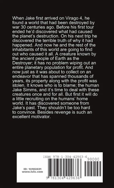 When Jake first arrived on Virago 4, he found a world that had been destroyed by war 30 centuries ago. Before his first tour ended he'd discovered what had caused the planet's destruction. On his next trip he discovered the terrible truth of why it had happened. And now he and the rest of the inhabitants of this world are going to find out who caused it all. A creature known by the ancient people of Earth as the Destroyer; it has no problem wiping out an entire planetary population for profit. And now just as it was about to collect on an endeavor that has spanned thousands of years, its property along with the profit was stolen. It knows who is to blame; the human Jake Simms, and it's time to deal with these creatures once and for all. But first it will do a little recruiting on the humans' home world. It has discovered someone from Jake's past. They shouldn't be too hard to convince. Besides revenge is such an excellent motivator.