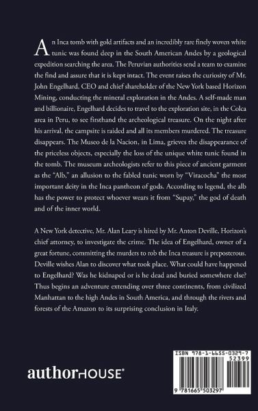 An Inca tomb with gold artifacts and an incredibly rare finely woven white tunic was found deep in the South American Andes by a geological expedition searching the area. The Peruvian authorities send a team to examine the find and assure that it is kept intact. The event raises the curiosity of Mr. John Engelhard, CEO and chief shareholder of the New York based Horizon Mining, conducting the mineral exploration in the Andes. A self-made man and billionaire, Engelhard decides to travel to the exploration site, in the Colca area in Peru, to see firsthand the archeological treasure. On the night after his arrival, the campsite is raided and all its members murdered. The treasure disappears. The Museo de la Nacion, in Lima, grieves the disappearance of the priceless objects, especially the loss of the unique white tunic found in the tomb. The museum archeologists refer to this piece of ancient garment as the "Alb," an allusion to the fabled tunic worn by "Viracocha" the most important deity in the Inca pantheon of gods. According to legend, the alb has the power to protect whoever wears it from "Supay," the god of death and of the inner world. A New York detective, Mr. Alan Leary is hired by Mr. Anton Deville, Horizon's chief attorney, to investigate the crime. The idea of Engelhard, owner of a great fortune, committing the murders to rob the Inca treasure is preposterous. Deville wishes Alan to discover what took place. What could have happened to Engelhard? Was he kidnaped or is he dead and buried somewhere else? Thus begins an adventure extending over three continents, from civilized Manhattan to the high Andes in South America, and through the rivers and forests of the Amazon to its surprising conclusion in Italy.