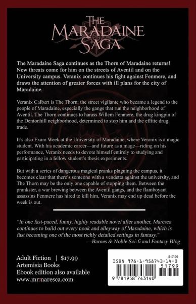 The Maradaine Saga continues as the Thorn of Maradaine returns! New threats come for him on the streets of Aventil and on the University campus. Veranix continues his fight against Fenmere, and draws the attention of greater forces with ill plans for the city of Maradaine. "Fantasy adventure readers, especially fans of spell-wielding students, will enjoy these lively characters and their high-energy story." - Publisher's Weekly Veranix Calbert is The Thorn: the street vigilante who became a legend to the people of Maradaine, especially the gangs that run the neighborhood of Aventil. The Thorn continues to harass Willem Fenmere, the drug kingpin of the Dentonhill neighborhood, determined to stop him and the effitte drug trade. It's also Exam Week at the University of Maradaine, where Veranix is a magic student. With his academic career-and future as a mage-riding on his performance, Veranix needs to devote himself entirely to studying and participating in a fellow student's thesis experiments. But with a series of dangerous magical pranks plaguing the campus, it becomes clear that there's someone with a vendetta against the university, and The Thorn may be the only one capable of stopping them. Between the prankster, a war brewing between the Aventil gangs, and the flamboyant assassins Fenmere has hired to kill him, Veranix may end up dead before the week is out.