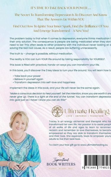 IT'S TIME TO TAKE BACK YOUR POWER ..... The Secret To Transforming Depression Is To Discover And Know That The Answers Lie Within YOU Find Out How To Ignite Your Inner Spark, Find the Brilliance Of You And Emerge Transformed - A New You! The problem today is that when it comes to depression, everyone thinks medication is their only solution. The consequence is people are being medicated when they don't need to be! This often leads to other problems with the individual never looking at or solving the real root cause. As a result, people are suffering unnecessarily. The truth is - change is possible, without medication. The reality is YOU can turn YOUR life around by taking responsibility for YOURSELF. This book is filled with practical, hands-on ways you can transform your life. In this book, you'll discover the 3 key ideas to turn your life around. You will learn how to: ¿ Take back your power ¿ Believe in yourself again ¿ Transform depression into self-love and happiness Implement the ideas in this book, and your life will never be the same again. "Make a conscious decision to heal yourself. Set the intention, know you are worth it and never give up. There is a light at the end of the tunnel. You can transform depression into gold just as I have! I know you can do this!" Tracey is an energy alchemist and therapist who has transformed her own life. Her passion is to assist people of all walks of life and ages to learn to reconnect, reclaim and remember to love themselves, to become empowered so they are able to transform themselves and their lives. She especially loves to empower young adults to live their best lives. To claim your free gift go to www.ultimatehealing.au