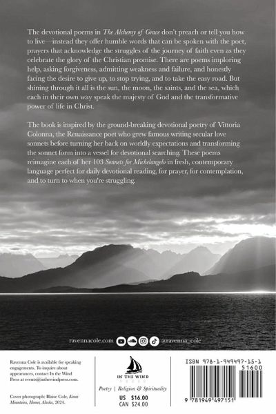 The devotional poems in The Alchemy of Grace don't preach or tell you how to live-instead they offer humble words that can be spoken with the poet, prayers that acknowledge the struggles of the journey of faith even as they celebrate the glory of the Christian promise. There are poems imploring help, asking forgiveness, admitting weakness and failure, and honestly facing the desire to give up, to stop trying, and to take the easy road. But shining through it all is the sun, the moon, the saints, and the sea, which each in their own way speak the majesty of God and the transformative power of life in Christ. The book is inspired by the ground-breaking devotional poetry of Vittoria Colonna, the Renaissance poet who grew famous writing secular love sonnets before turning her back on worldly expectations and transforming the sonnet form into a vessel for devotional searching. These poems reimagine each of her 103 Sonnets for Michelangelo in fresh, contemporary language perfect for daily devotional reading, for prayer, for contemplation, and to turn to when you're struggling. Ravenna Cole grew up in a trailer in rural Pennsylvania and moved to the Arizona desert when she was in high school. Raised in non-denominational churches, she left her faith behind while studying philosophy in college. It was during her preparation for a PhD dissertation on Kierkegaard that she started to take Christianity seriously again, which ultimately led to her reception into the Catholic Church. Cole is cast in the mold of ancient philosophers, for whom thinking is done while walking and talking and ideas are tried in the fires of life. After her conversion, she adopted a nomadic life in search of a more poetic way to dwell, living most of the last decade on a small sailboat with her husband and four children. Cole began writing poetry seriously after the birth of her first child and studied for a time in a creative writing MFA program but left it to pursue a poetic vision outside of the academy. She currently divides her time between Florida and Alaska.