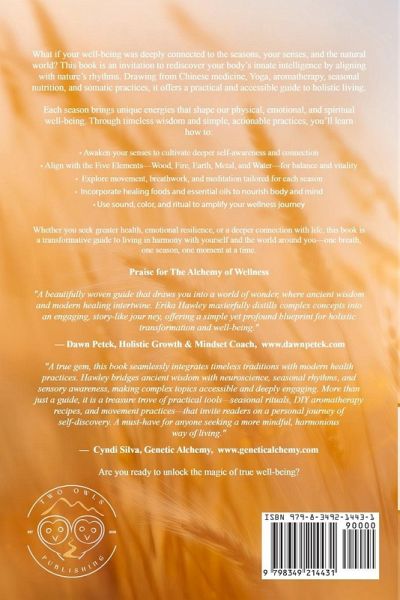 "Are you ready to transform your health and align with the wisdom of nature?" Unlock the Magic of True Well-Being with The Alchemy of Wellness What if your health and vitality were deeply connected to the rhythms of nature, the wisdom of the seasons, and the power of your own senses? The Alchemy of Wellness is your guide to rediscovering balance, resilience, and connection through the timeless teachings of Chinese medicine, Yoga, aromatherapy, seasonal nutrition, and somatic practices. With practical tools and ancient wisdom seamlessly woven together, this book offers a holistic path to living in harmony with yourself and the world around you. Align with Nature's Cycles - Work with the five elements and seasonal transitions to cultivate balance and vitality. Awaken Your Senses - Engage touch, taste, smell, sight, and sound as gateways to deeper self-awareness. Move, Breathe, and Meditate - Explore yoga postures, breathwork, and mindfulness practices tailored for each season. Nourish Your Body & Soul - Incorporate healing foods, essential oils, and rituals to support well-being. Amplify Your Energy - Use sound, color, and intentional living to create lasting transformation. This book isn't just a collection of practices-it's an invitation to step into your own rhythm, embrace your natural cycles, and cultivate a life filled with intention, healing, and harmony. Are you ready to awaken your senses, align with nature, and transform your well-being? Dive into The Alchemy of Wellness and begin your journey today!